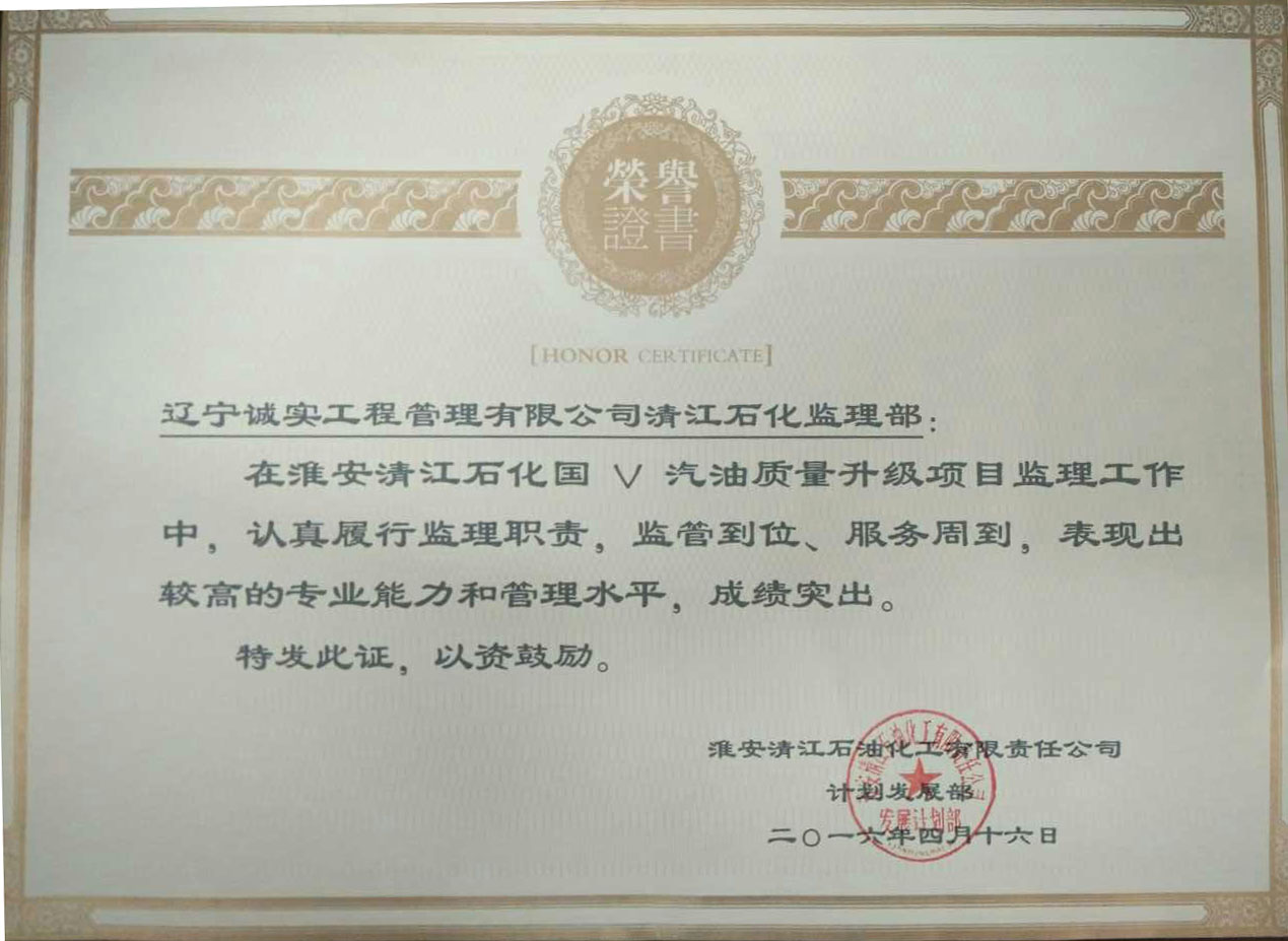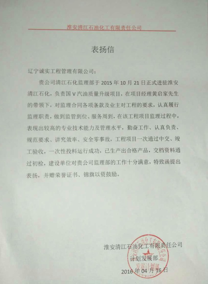 我公司監(jiān)理人員在“中石化淮安清江石油化工有限責(zé)任公司國Ⅴ汽油質(zhì)量升級項目”工程監(jiān)理服務(wù)工作中,得到了建設(shè)單位的一致認可和肯定,對我們的工作表示十分滿意,特發(fā)函提出表揚,并贈與榮譽證書、錦旗以資鼓勵。