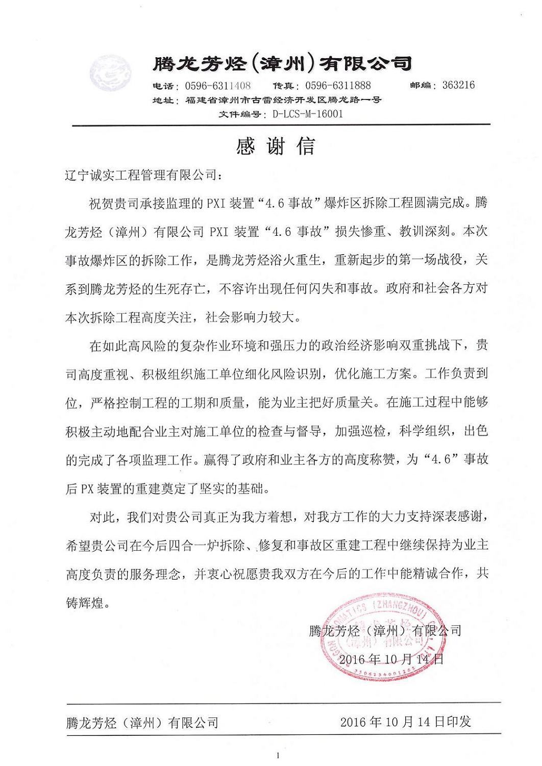 我公司監(jiān)理人員在“騰龍芳烴(漳州)有限公司PXI裝置4.6事故爆炸區(qū)拆除”工程監(jiān)理服務(wù)工作中,得到了業(yè)主單位的認(rèn)可和肯定,對我們的工作表示十分滿意,特發(fā)感謝信提出表揚(yáng)。
