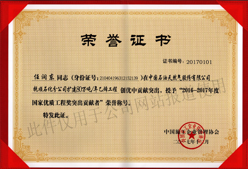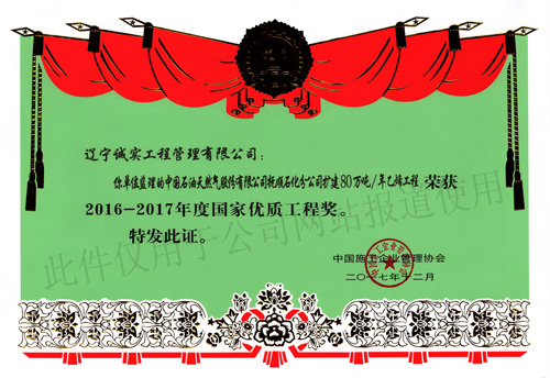 2017年11月10日,根據(jù)中施企協(xié)字【2017】66號文件——《關于表彰2016-2017年度國家優(yōu)質(zhì)工程獎的決定》公告,我單位所監(jiān)理的“中國石油天然氣股份有限公司撫順石化分公司擴建80萬噸/年乙烯工程”榮獲2016-2017年度國家優(yōu)質(zhì)工程獎,該項目總監(jiān)“任潤東”還獲得了“2016-2017年度第二批國家優(yōu)質(zhì)工程獎突出貢獻者”的榮譽稱號。