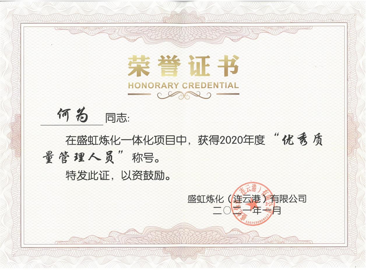 熱烈祝賀何為同志榮獲盛虹煉化一體化項(xiàng)目2020年度“優(yōu)質(zhì)質(zhì)量管理人員”榮譽(yù)稱號