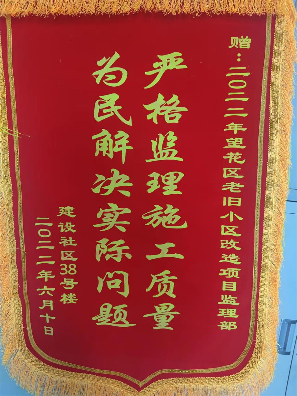 千濤萬漉雖辛苦,吹盡狂沙始到金。一面錦旗既是一份肯定。我們將秉承“誠實、責(zé)任、專業(yè)、超越”的監(jiān)理精神,接受政府和市民的共同監(jiān)督,一如既往、不忘初心、盡職盡責(zé),為推動老舊小區(qū)改造,優(yōu)化小區(qū)環(huán)境治理,建設(shè)文明城市做出應(yīng)有的貢獻(xiàn)!
