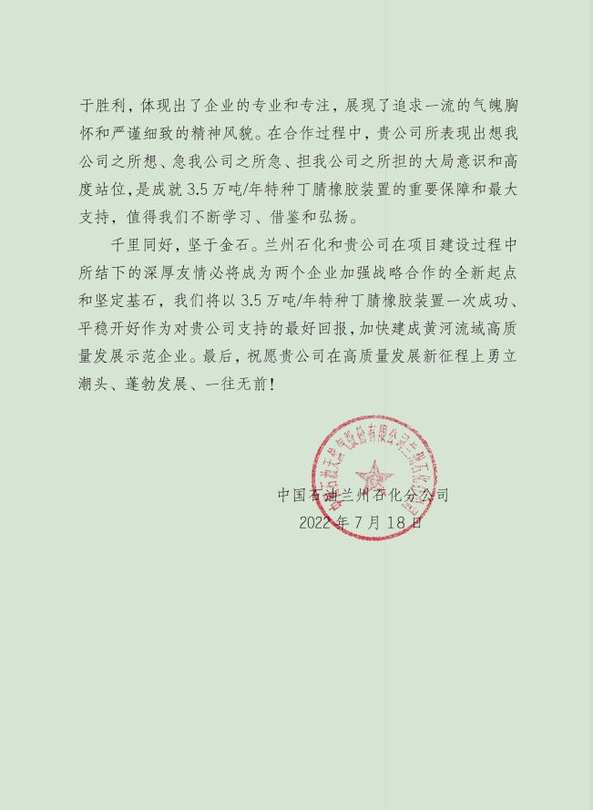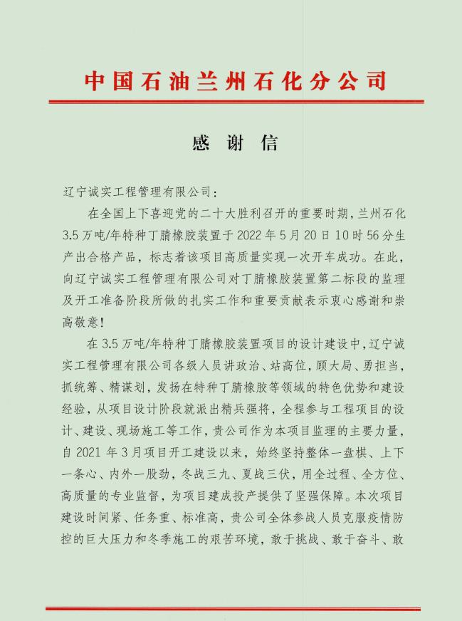 近日,由我公司監(jiān)理的中國石油天然氣股份有限公司蘭州石化分公司--3.5萬砘/年特種丁腈橡膠項(xiàng)目喜獲業(yè)主表揚(yáng)信。表揚(yáng)信充分肯定了誠實(shí)監(jiān)理的工作成果,對駐蘭州項(xiàng)目部全體監(jiān)理工程師在項(xiàng)目建設(shè)過程中所付出的努力表示由衷的感謝。