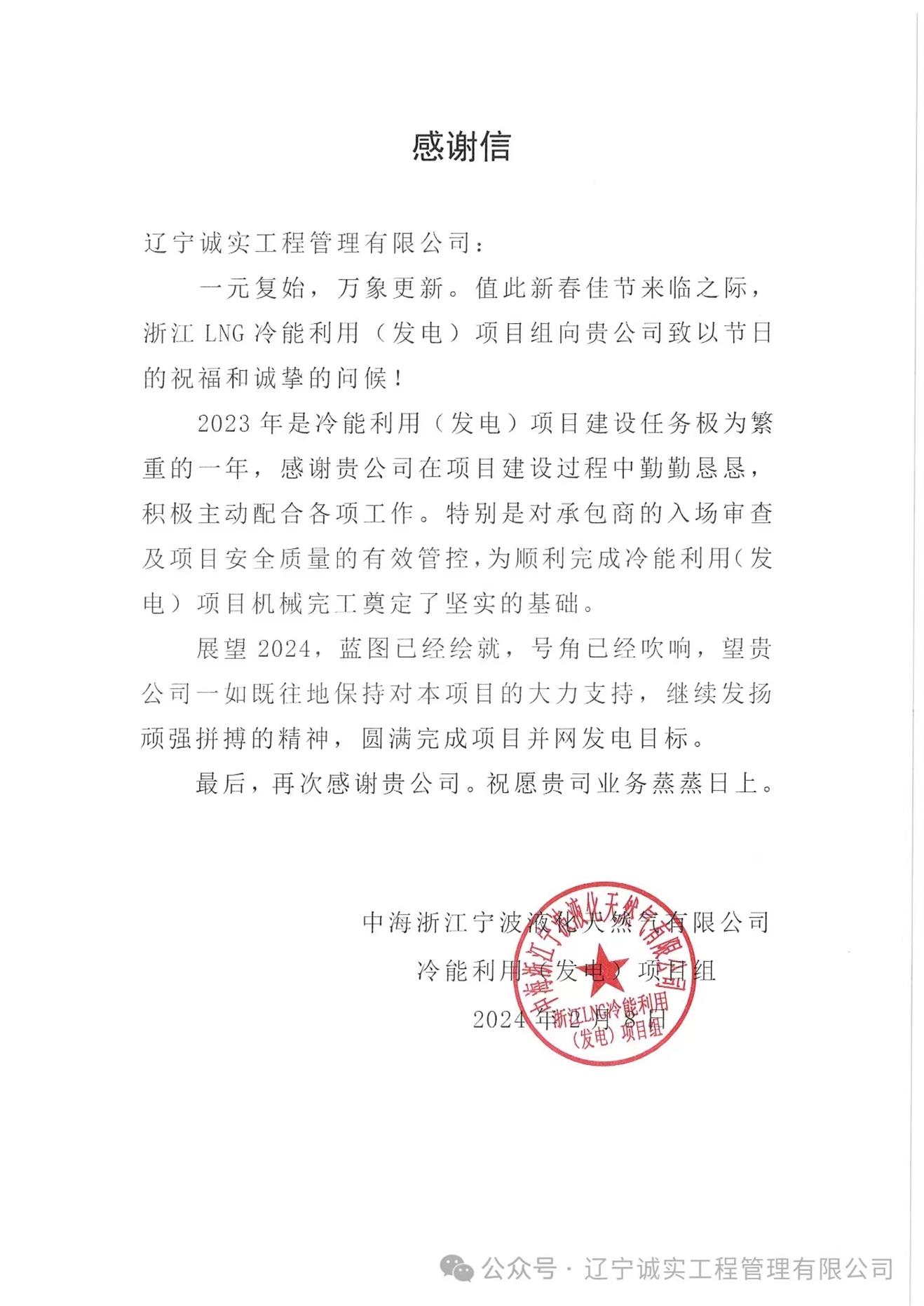 浙江LNG冷能利用(發(fā)電)項目組向公司發(fā)來了感謝信,信中肯定了公司項目部人員在2023年的努力,特別是對于承包商入場審查及項目安全質(zhì)量的有效管控,為項目機械完工奠定了堅實的基礎(chǔ)。該項目是積極響應(yīng)國家及浙江省“十四五”規(guī)劃的節(jié)能減排政策,落實“綠色低碳”發(fā)展戰(zhàn)略的示范項目,項目投產(chǎn)后,預(yù)計年凈發(fā)電量約為2408萬度,節(jié)省標(biāo)準(zhǔn)煤超3000tce,年減少CO₂排放可達18000多噸。展望2024年,項目部在黃思敏總監(jiān)的帶領(lǐng)下,將認真執(zhí)行監(jiān)理職責(zé),積極推進項目建設(shè),爭取項目早日建成投產(chǎn)。