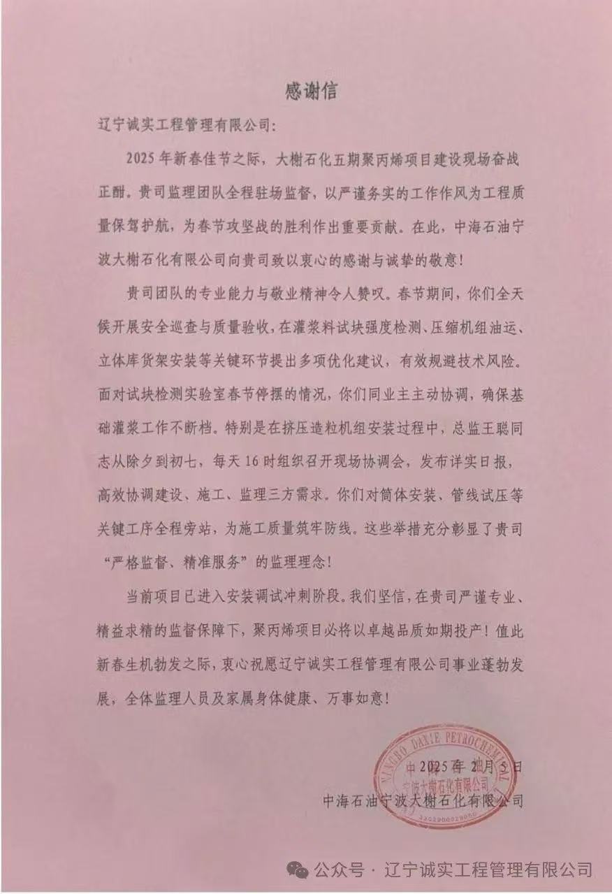 2025年2月5日,當(dāng)許多人仍沉浸在新春佳節(jié)的喜悅之中時(shí),中海油大榭石化五期聚丙烯項(xiàng)目監(jiān)理部以專業(yè)、奉獻(xiàn)的精神為項(xiàng)目安裝調(diào)試沖刺的關(guān)鍵過(guò)程保駕護(hù)航,并收獲到來(lái)自中海石油寧波大榭石化有限公司發(fā)來(lái)的一封感謝信。
