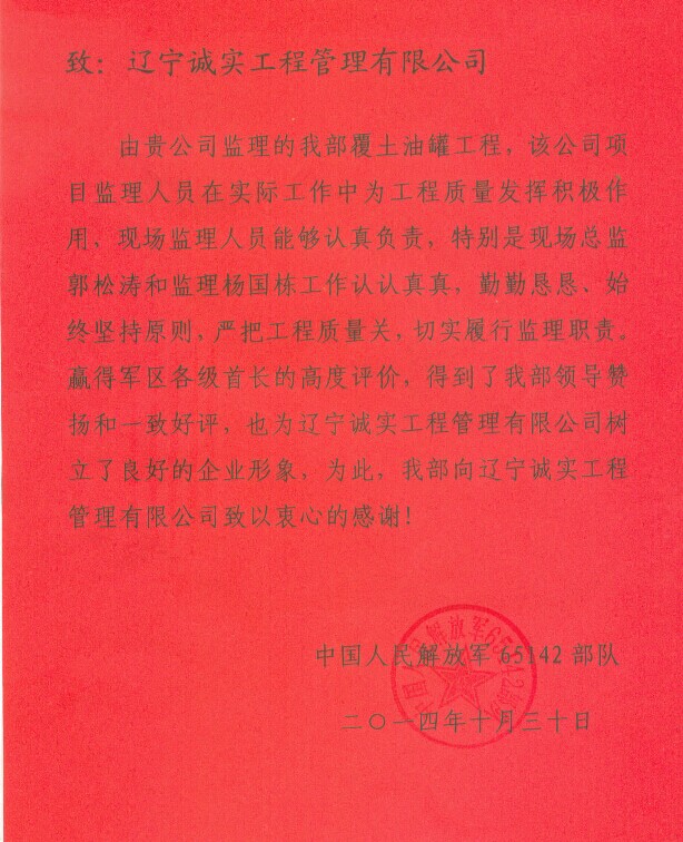 中國人民解放軍65142部隊(duì)系于今年2月份與我公司共同簽署了65142部隊(duì)油庫安全專項(xiàng)整治油罐翻建工程項(xiàng)目監(jiān)理合同,該項(xiàng)目位于遼寧省鐵嶺縣腰堡鎮(zhèn),投資總額為2380萬元。自合作以來,業(yè)主對(duì)我公司監(jiān)理人員的工作十分滿意,給予了很高的評(píng)價(jià)與肯定。